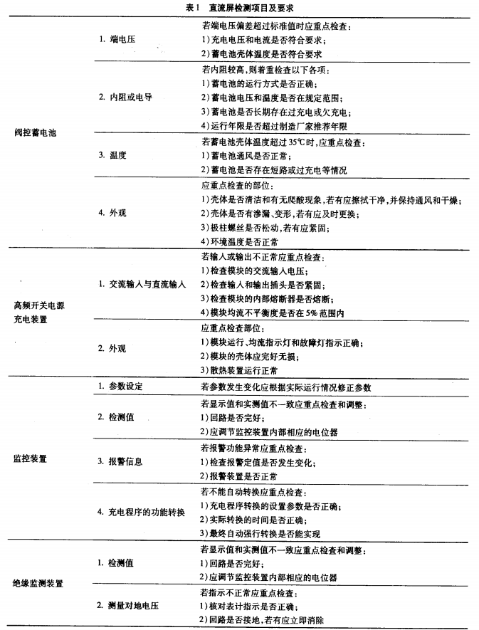 在建立完善的點檢制度之前,首要必須制定契合現場要求,并可以作為依據的設備檢修標準。在直流屏標準中規則了直流電源體系設備檢修的基本要求,檢修前的準備、檢測項目、充放電試驗等內容。直流屏主要由蓄電池.高頻開關電源充電設備,監控設備、絕緣監測設備4部分組成,見表1