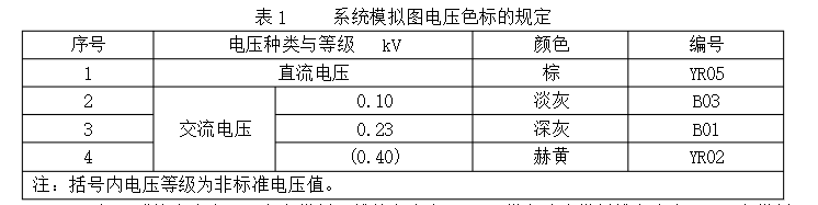 10.3體系模擬圖應依據運轉電壓等級,按表1規則的色彩標明,色彩所對應的色標,由制作廠或制作廠與用戶之間洽談確定。