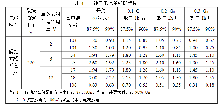 鉛酸蓄電池的事端放電能力試驗的沖擊電流應根據蓄電池放電狀況、放電的停止電壓和蓄電池組的個數來挑選,其事端放電沖擊電流系數由表4來確認。