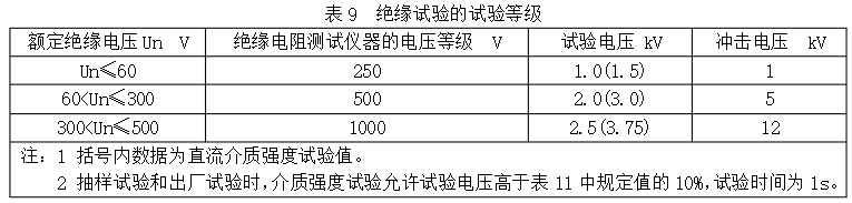 以上所列部位,應能承受頻率為50Hz±5Hz之間,表9所列的正弦波實驗電壓值(也可采用直流電壓),歷時1min的實驗,絕緣不該出現擊穿或閃絡現象。