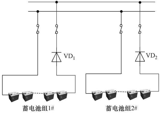 在外部交流供電異常時,蓄電池組由連接在直流屏正極與蓄電池組正極之間的大功率二極管VD1/VD2無縫對負載進行供電。放電通道并聯等效電路如圖4所示。在電池組并聯時,即便兩組電池存在電壓差,高電壓蓄電池組與低電壓蓄電池組之間也不導通,不存在充電回路,故避免了環流現象的產生。