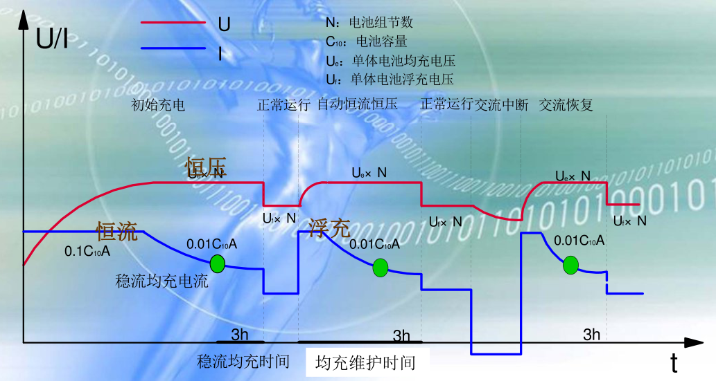 浮充:在正常運行時,充電裝置承擔(dān)經(jīng)常負荷,同時向蓄電池組補充充電,以補充蓄電池的自放電,使蓄電池以滿容量的狀態(tài)處于備用。