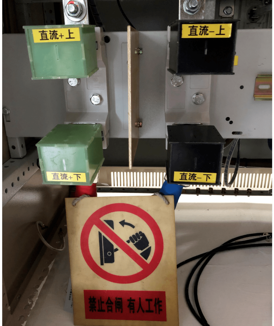 3. 取下蓄電池組保險后,在蓄電池保險的底座正極上下兩端、負極上下兩端分別套上大小合適的絕緣盒,并在絕緣盒上分別掛禁止合閘,有人工作!標示牌。