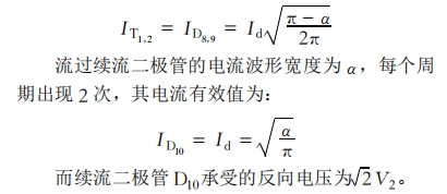 加了續流二極管后其輸出電壓波形V3與不加續流二極管時相同。原先流經橋臂上元件的續流電流變成經過二極管續流。各原件中流過的電流波形和變壓器副邊電流波形顯著有必定的間隔。每個周期中流過晶閘管T1、T2、D8、D9的電流波形寬度都是π—α,其電流有效值為(Id為負載電流)